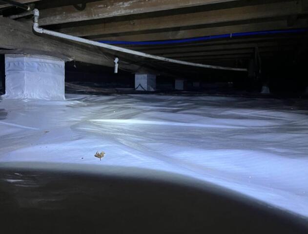 This messy and damp crawlspace is now looking new and fresh with all that clutter out of the way and our durable Cleanspace Liner placed down. The liner is making sure the damp floor doesn't cause any moisture damage, while that crawlspace dehumidifier you see is keeping the humidity at a safe percentage. This also helps prevent moisture damage, while making sure mold cannot thrive in the crawlspace.