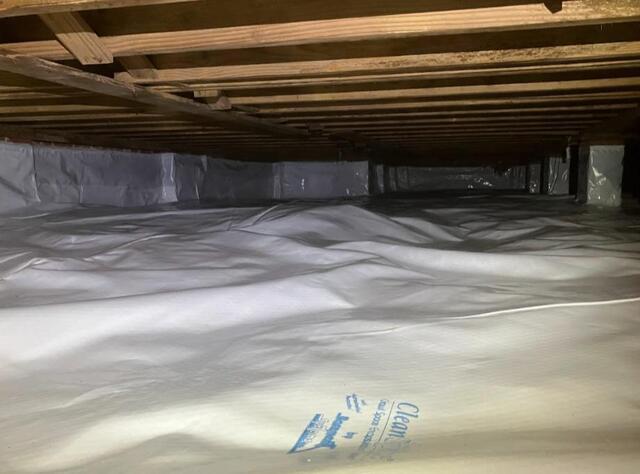 In order to combat the moisture issues they were facing, these homeowners originally had someone come in and install a standard vapor barrier. Over the years, the same problems persisted, and if you look at the before image, it isn't hard to tell why. We found the barrier withered, torn, and exposed. It was time for an upgrade! That is where our CleanSpace Liner comes in. This liner is much more durable and resistant than your average vapor barrier. Rather than just being placed on the ground, the CleanSpace Liner is fastened to each part of the crawl space, including the walls and supports. It also works together as part of a complete system with some of our other crawl space products, including the dehumidifier you can see in the after image. These combined create the encapsulation system, which is made to fight moisture from all forms and directions - intrusion, standing, and humidity.